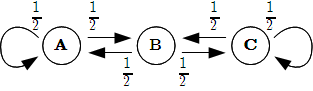 \(n\) 回目の後, A , B , C が赤玉を持った状態から, \(n+1\) 回目で赤玉を誰が持つことになるか, を表す状態遷移は下図のようになる.