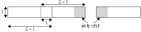 長方形 \(A\) の作り方. \(L\) 枚の紙を横に並べて, 順に \(1\) 辺 \(1\) cm の正方形をのりしろとして(隣り合う紙が横 \(1\) cm 重なるように)はり合わせ, 縦 \(1\) cm の横長の長方形を作る.