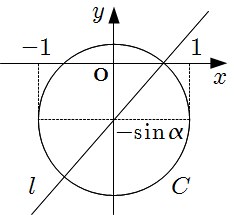 \(\alpha\) を \(0 \lt \alpha \lt \dfrac{\pi}{2}\) を満たす定数とする. 円 \(C : \ x^2+( y+ \sin \alpha )^2 = 1\) および, その中心を通る直線 \(l : \ y = ( \tan \alpha )x -\sin \alpha\) を考える. このとき, 以下の問いに答えよ.