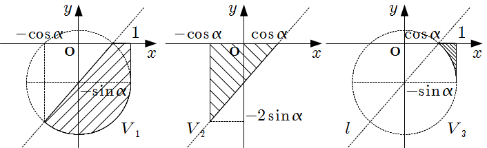 求める体積 \(V\) は, 上図の回転体の体積 \(V _ 1 , V _ 2 , V _ 3\) を用いて \[ V = V _ 1 -V _ 2 -V _ 3 \] と表せる. \[\begin{align} V _ 1 & = \pi \displaystyle\int _ {-\cos \alpha}^1 \left( -\sin \alpha -\sqrt{1-x^2} \right)^2 \, dx \\ & = \pi \displaystyle\int _ {-\cos \alpha}^1 ( 1-x^2) \, dx \\ & \qquad +2 \pi \sin \alpha \displaystyle\int _ {-\cos \alpha}^1 \sqrt{1-x^2} \, dx +\pi \sin^2 \alpha ( 1 +\cos \alpha ) , \\ V _ 2 & = \dfrac{1}{3} \cdot \pi ( 2 \sin \alpha )^2 \cdot 2 \cos \alpha = \dfrac{8 \pi}{3} \sin^2 \alpha \cos \alpha , \\ V _ 3 & = \pi \displaystyle\int _ {\cos \alpha}^1 \left( -\sin \alpha +\sqrt{1-x^2} \right)^2 \, dx \\ & = \pi \displaystyle\int _ {\cos \alpha}^1 ( 1-x^2) \, dx \\ & \qquad +2 \pi \sin \alpha \displaystyle\int _ {\cos \alpha}^1 \sqrt{1-x^2} \, dx +\pi \sin^2 \alpha ( 1 -\cos \alpha ) \end{align}\] 以上を用いれば \[\begin{align} V & = \pi \displaystyle\int _ {-\cos \alpha}^{\cos \alpha} ( 1-x^2 ) \, dx \\ & \quad +2 \pi \sin \alpha \left( \displaystyle\int _ {-\cos \alpha}^1 \sqrt{1-x^2} \, dx +\displaystyle\int _ {\cos \alpha}^1 \sqrt{1-x^2} \, dx \right) \\ & \qquad -\dfrac{2 \pi}{3} \sin^2 \alpha \cos \alpha \\ & = 2 \pi \displaystyle\int _ {0}^{\cos \alpha} ( 1-x^2) \, dx \\ & \quad +2 \pi \sin \alpha \left( 2 \displaystyle\int _ {\cos \alpha}^1 \sqrt{1-x^2} \, dx +\displaystyle\int _ {-\cos \alpha}^{\cos \alpha} \sqrt{1-x^2} \, dx \right) \\ & \qquad -\dfrac{2 \pi}{3} \sin^2 \alpha \cos \alpha \\ & = 2 \pi \left[ x -\dfrac{x^3}{3} \right] _ 0^{\cos \alpha} +2\pi \sin \alpha \cdot \dfrac{\pi}{2} \\ & \qquad -\dfrac{2 \pi}{3}( 1 -\cos^2 \alpha ) \cos \alpha \quad ( \ \text{∵} \ \text{(2)の結果} ) \\ & = 2\pi \left( \cos \alpha -\dfrac{\cos^3 \alpha}{3} \right) +\pi^2 \sin \alpha -\dfrac{2 \pi}{3} ( 1 -\cos^2 \alpha ) \cos \alpha \\ & = \underline{\dfrac{4\pi}{3} \cos \alpha +\pi^2 \sin \alpha} \end{align}\]