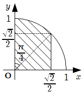 求める定積分を \(I\) とおく. \[ I = \underline{\displaystyle\int _ 0^{\frac{1}{2}} x \sqrt{1 -2x^2} \, dx} _ {[ \text{A} ]} + \underline{\displaystyle\int _ 0^{\frac{1}{2}} \sqrt{1 -2x^2} \, dx} _ {[ \text{B} ]} \] [A] について \[\begin{align} [ \text{A} ] & = \dfrac{1}{4} \displaystyle\int _ 0^{\frac{1}{2}} \sqrt{1 -2x^2} \, ( 2x^2 )' \, dx \\ & = \dfrac{1}{4} \left[ -\dfrac{2}{3} ( 1-2x^2 )^{\frac{3}{2}} \right] _ 0^{\frac{1}{2}} \\ & =\dfrac{1}{6} \left\{ 1 -\left( \dfrac{1}{2} \right)^{\frac{3}{2}} \right\} \\ & = \dfrac{1}{6} -\dfrac{\sqrt{2}}{24} \end{align}\] [B] について, \(u = \sqrt{2} x\) と置換すると \[\begin{align} & du = \sqrt{2} dx , \\ & \begin{array}{c|ccc} x & 0 & \rightarrow & \dfrac{1}{2} \\ \hline u & 0 & \rightarrow & \dfrac{\sqrt{2}}{2} \end{array} \end{align}\] なので \[ [ \text{B} ] = \dfrac{\sqrt{2}}{2} \underline{\displaystyle\int _ 0^{\frac{\sqrt{2}}{2}} \sqrt{1-u^2} \, du} _ {[ \text{C} ]} \] [C] は下図斜線部の面積を表すので