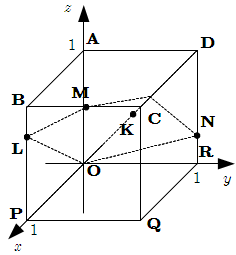 座標空間に \(8\) 点 \[\begin{align} & \text{O} \ (0,0,0) , \quad \text{P} \ (1,0,0) , \quad \text{Q} \ (1,1,0) , \quad \text{R} \ (0,1,0) , \\ & \text{A} \ (0,0,1) , \quad \text{B} \ (1,0,1) , \quad \text{C} \ (1,1,1) , \quad \text{D} \ (0,1,1) \end{align}\] をとり, 線分 BC の中点を M とする. 線分 RD 上の点を N \((0,1,t)\) とし, \(3\) 点 O , M , N を通る平面と線分 PD および線分 PB との交点をそれぞれ K , L とする.