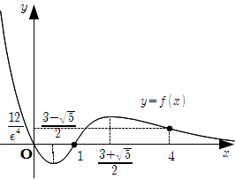 \[\begin{align} f'(x) & = (2x-1) e^{-x} -(x^2-x) e^{-x} \\ & = -(x^2-3x+1) e^{-x} \\ & = -\left( x -\dfrac{3-\sqrt{5}}{2} \right) \left( x -\dfrac{3+\sqrt{5}}{2} \right) e^{-x} , \\ f''(x) & = -(2x-3) e^{-x} +(x^2-3x+1) e^{-x} \\ & = (x^2-5x+4) e^{-x} \\ & = (x-1)(x-4) e^{-x} \end{align}\] また \[ \displaystyle\lim _ {x \rightarrow -\infty} f(x) = \displaystyle\lim _ {t \rightarrow \infty} (t^2+t) e^t = \infty \] \(x \gt 0\) において, \(0 \lt f(x) \lt x^2 e^{-x}\) であり \[ \displaystyle\lim _ {x \rightarrow \infty} x^2 e^{-x} = 0 \] なので, はさみうちの原理より \[ \displaystyle\lim _ {x \rightarrow \infty} f(x) = 0 \] 以上より, \(f(x)\) の増減と凹凸は下表のようになる. \[ \begin{array}{c|ccccccccccc} x & ( -\infty ) & \cdots & \frac{3-\sqrt{5}}{2} & \cdots & 1 & \cdots & \frac{3+\sqrt{5}}{2} & \cdots & 4 & \cdots & ( \infty ) \\ \hline f'(x) & & - & 0 & + & & + & 0 & - & & - & \\ \hline f''(x) & & + & & + & 0 & - & & - & 0 & + & \\ \hline f(x) & ( \infty ) & \searrow ( \cup ) & \text{極小} & \nearrow ( \cup ) & 0 & \nearrow ( \cap ) & \text{極大} & \searrow ( \cap ) & \frac{12}{e^4} & \searrow ( \cup ) & (0) \end{array} \] よって, \(y = f(x)\) の変曲点は \[ \underline{(1,0) , \left( 4 , \dfrac{12}{e^4} \right)} \] であり, グラフの概形は下図のようになる.
