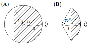 求める体積 \(V\) は, 下図 (A) , (B) の回転体の体積 \(V _ 1 , V _ 2\) を用いて,