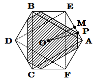 また, AE の中点を M とおいて, 平面 \(z=t\) での正八面体の切り口を \(z\) 軸方向から見ると, 下図斜線部のようになる.