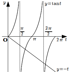 \[\begin{align} \dfrac{dx}{dt} & = -2\sin 2t , \\ \dfrac{dy}{dt} & = \sin t +t \cos t \end{align}\] \(0 \leqq t \leqq 2 \pi\) において \[\begin{align} \dfrac{dx}{dt} & = -2\sin 2t =0 \\ \text{∴} \quad t =0 , & \dfrac{\pi}{2} , \pi , \dfrac{3 \pi}{2} , 2 \pi \end{align}\] また \[\begin{align} \dfrac{dy}{dt} = \sin t +t \cos t & =0 \\ \text{∴} \quad \tan t & = -t \quad ... [1] \end{align}\] \(y= \tan t\) と \(y =-t\) のグラフは下図のようになる.