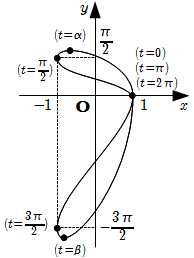 したがって, [1] の解は \[ t = 0 , \alpha , \beta \quad \left( \ \dfrac{\pi}{2} \lt \alpha \lt \pi , \dfrac{3 \pi}{2} \lt \beta <2 \pi \ \right) \] 以上より, \((x, y)\) の増減表は下表の通りとなる. \[ \begin{array}{c|ccccccccccccc} t & 0 & \cdots & \dfrac{\pi}{2} & \cdots & \alpha & \cdots & \pi & \cdots & \dfrac{3 \pi}{2} & \cdots & \beta & \cdots & 2\pi \\ \hline \frac{dx}{dt} & 0 & - & 0 & + & & + & 0 & - & 0 & + & & + & 0 \\ \hline \frac{dy}{dt} & 0 & + & & + & 0 & - & & - & & - & 0 & + & \\ \hline x & 1 & \leftarrow & -1 & \rightarrow & & \rightarrow & 1 & \leftarrow & -1 & \rightarrow & & \rightarrow & 1 \\ \hline y & 0 & \uparrow & \dfrac{\pi}{2} & \uparrow & \max & \downarrow & 0 & \downarrow & -\dfrac{3 \pi}{2} & \downarrow & \min & \uparrow & 0 \end{array} \] ゆえに, 与えられた曲線の概形は下図のようになる.