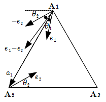 \(\overrightarrow{e _ 1} -\overrightarrow{e _ 2}\) と \(\overrightarrow{a _ 1}\) のなす角 \(\theta\) について考えると \[ \left| \dfrac{\theta _ 1 +\left( \dfrac{\pi}{3} -\theta _ 2 \right)}{2} -\theta _ 1 \right| = \left| \dfrac{\pi}{6} -\dfrac{\theta _ 1 +\theta _ 2}{2} \right| \] これと (1) の結果より \[\begin{gather} \left| \dfrac{\pi}{6} -\dfrac{\theta _ 1 +\theta _ 2}{2} \right| \leqq \alpha \\ -2 \alpha \leqq \dfrac{\pi}{3} -\left( \theta _ 1 +\theta _ 2 \right) \leqq 2\alpha \\ \text{∴} \quad \underline{\dfrac{\pi}{3} -2\alpha \leqq \theta _ 1 +\theta _ 2 \leqq \dfrac{\pi}{3} +2\alpha} \end{gather}\]
