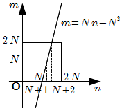 条件より \[ 1 \leqq m \leqq 2N , \ 1 \leqq n \leqq 2N \quad ... [1] \] \(f(x) = x^2 -nx +m\) とおく. \[ f(x) =\left( x -\dfrac{n}{2} \right)^2 -\dfrac{n^2}{4} +m \] [1] より, \(0 \lt \dfrac{n}{2} \leqq N\) なので, \(f(x)=0\) が \(N\) 以上の実数解をもつ条件は \[\begin{align} f(N) & =N^2 -nN +m \leqq 0 \\ \text{∴} \quad m & \leqq Nn -N^2 \quad ... [2] \end{align}\] ゆえに, [1] [2] を満たす領域に含まれる格子点の個数を求めればよい.