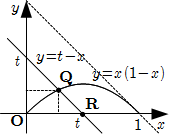 [1] と \(C\) の交点を \(Q\) , [1] と \(y=0\) との交点を \(R\) とおけば \[ S(t) = \pi \left( PR^2 -PQ^2 \right) \] ここで, [1] と \(C\) の式より \[\begin{align} x(1-x) & = t-x \\ x^2-2x+t & = 0 \\ \text{∴} \quad x = 1 & -\sqrt{1-t} \quad ( \ \text{∵} \ 0 \leqq x \leqq 1 ) \\ \text{∴} \quad y = t & -\left( 1 -\sqrt{1-t} \right) = t-1 +\sqrt{1-t} \end{align}\] なので, \(Q \ \left( 1 -\sqrt{1-t} , t-1 +\sqrt{1-t} , 0 \right)\) .