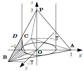 \(xyz\) 空間に \(4\) 点 P \((0,0,2)\) , A \((0,2,0)\) , B \((\sqrt{3},-1,0)\) , C \((-\sqrt{3},-1,0)\) をとる. 四面体 PABC の \(x^2+y^2 \geqq 1\) をみたす部分の体積を求めよ.